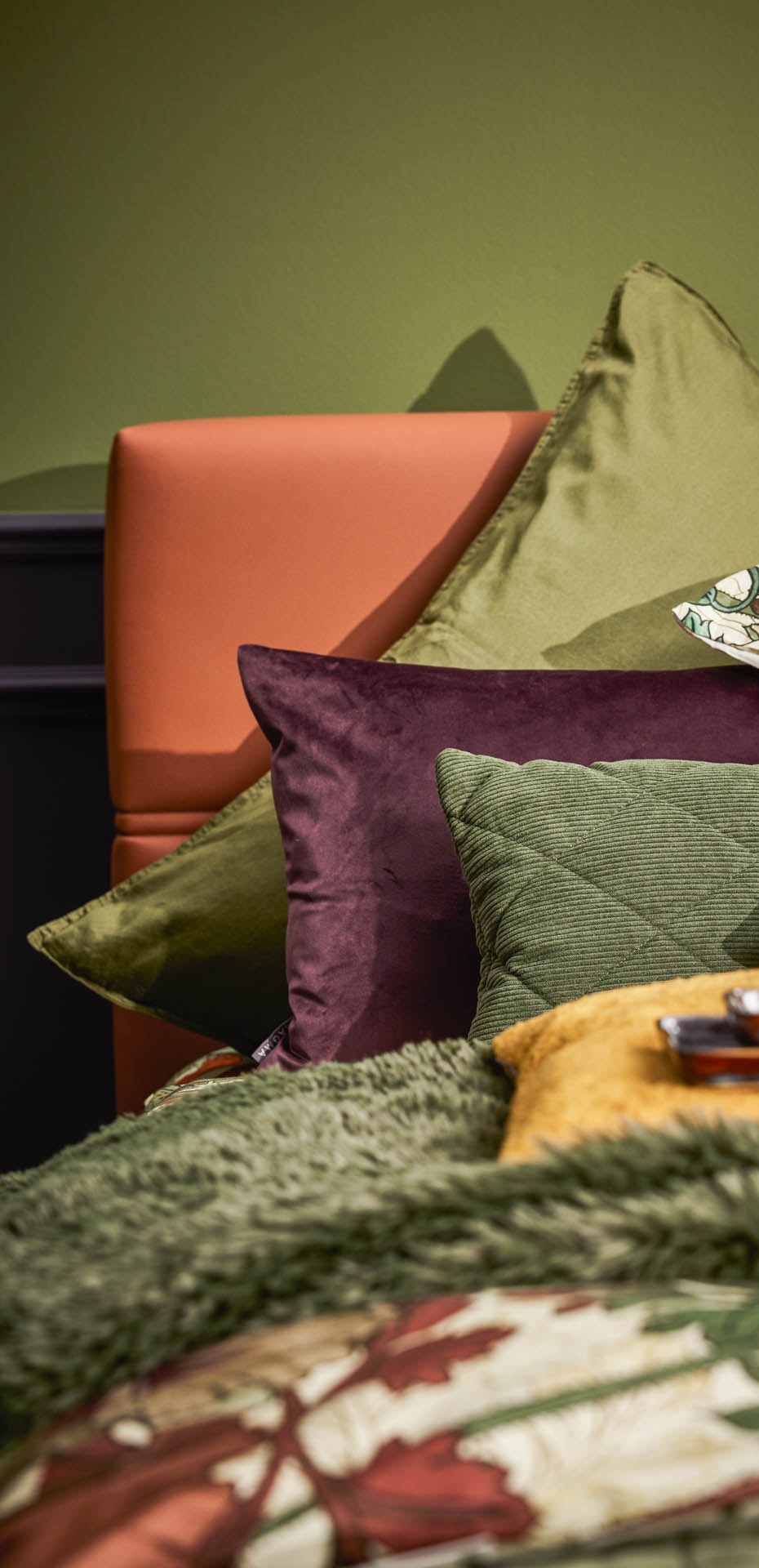 On le combine ici à de l’orange, du vert et des motifs floraux et l’atmosphère devient lumineuse et tonique tout en préservant son côté chaleureux. Une jolie harmonie de couleurs vives et sobres pour une chambre aussi reposante que dans l’air du temps !